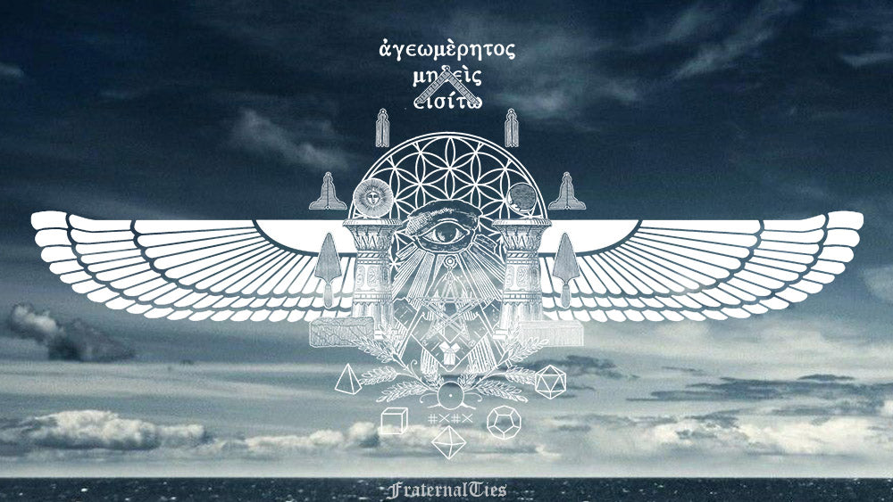 The 2nd Edition shirt features a large print on the front, and a print of a smaller winged version of the artwork on the back with a Greek encryption which translates to "Let no one ignorant of geometry enter"- a phrase that was engraved at the door of Plato's Academy, the school he had founded in Athens.